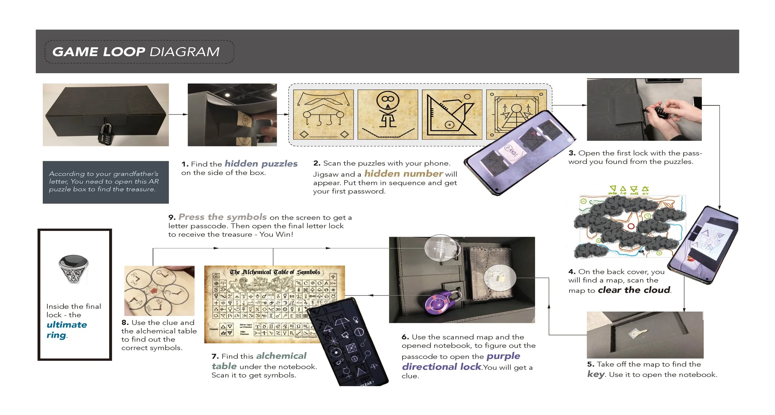PUZZLE BOX is a physical box device incorporated with AR technology that requires Android/IOS to play. In this game, players are asked to break down a series of secret codes inscribed inside the box, with the help of AR, to get the treasure and win the game.
