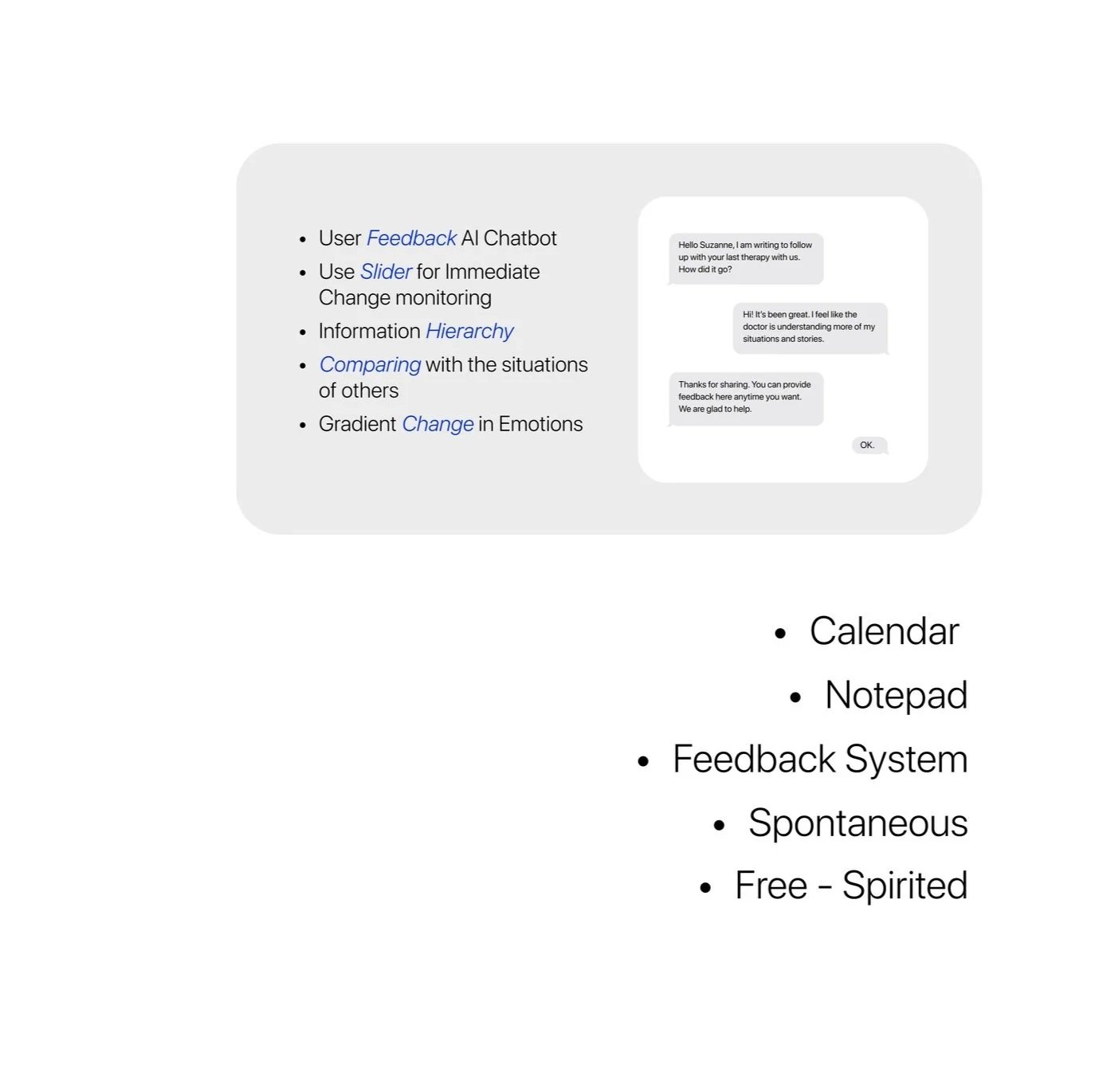 The notepad is a motivational mechanism for the patients to record their therapy sessions as single stories on “sticky notes” shaped interface, where concise, instant, sporadic, and inspirational. They are captioned with a short, fun, and abstract phrases that aim to generate a sense of creativity.