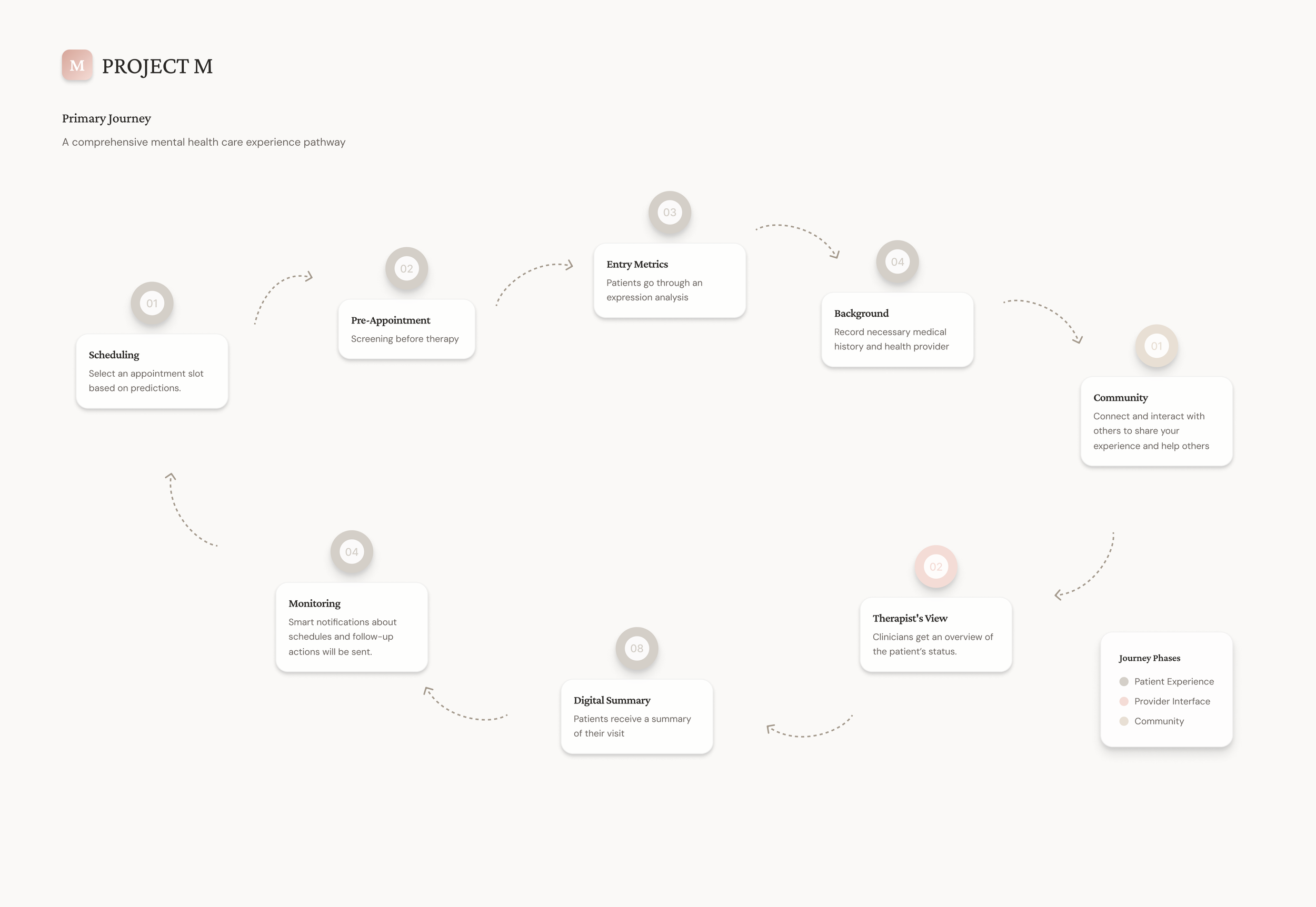 The IPMD Project M, Emotional AI, is initiated in collaboration with Google Cloud to address the growing need for effective mental health care. With approximately 1 in 5 adults experiencing mental illness in a given year, and more than 50% of people with mental health issues not receiving treatment, there is a significant demand for innovative solutions that improve the effectiveness of therapy. As the sole designer for this project, I aim to address the problem of enhancing the effectiveness of therapy by visualizing emotion data from AI algorithms and by encouraging users to share their behavioral and thinking record outside of therapy session.