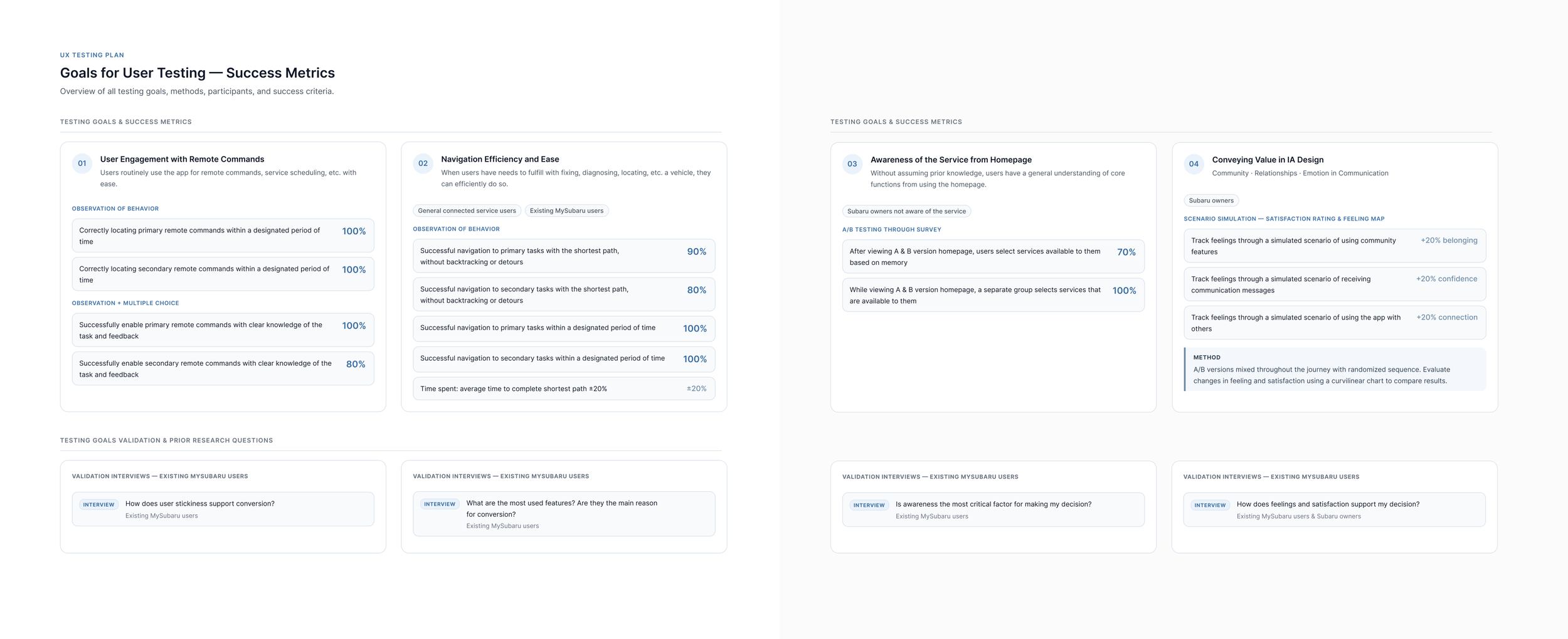 The following diagnostics map covers user onboarding (Checkpoint I - III), and retention (Checkpoint IV). It covers the entire journey from when a customer purchases a Subaru to when they successfully subscribe and engage with the MySubaru Service. Here, we exclusively focuses on the final checkpoints. Previous checkpoints and rationale that led to the creation of this map can be found on the Subaru Onboarding case.