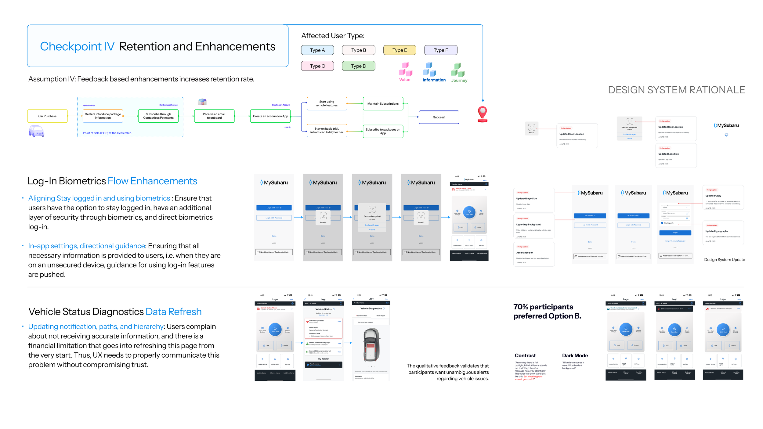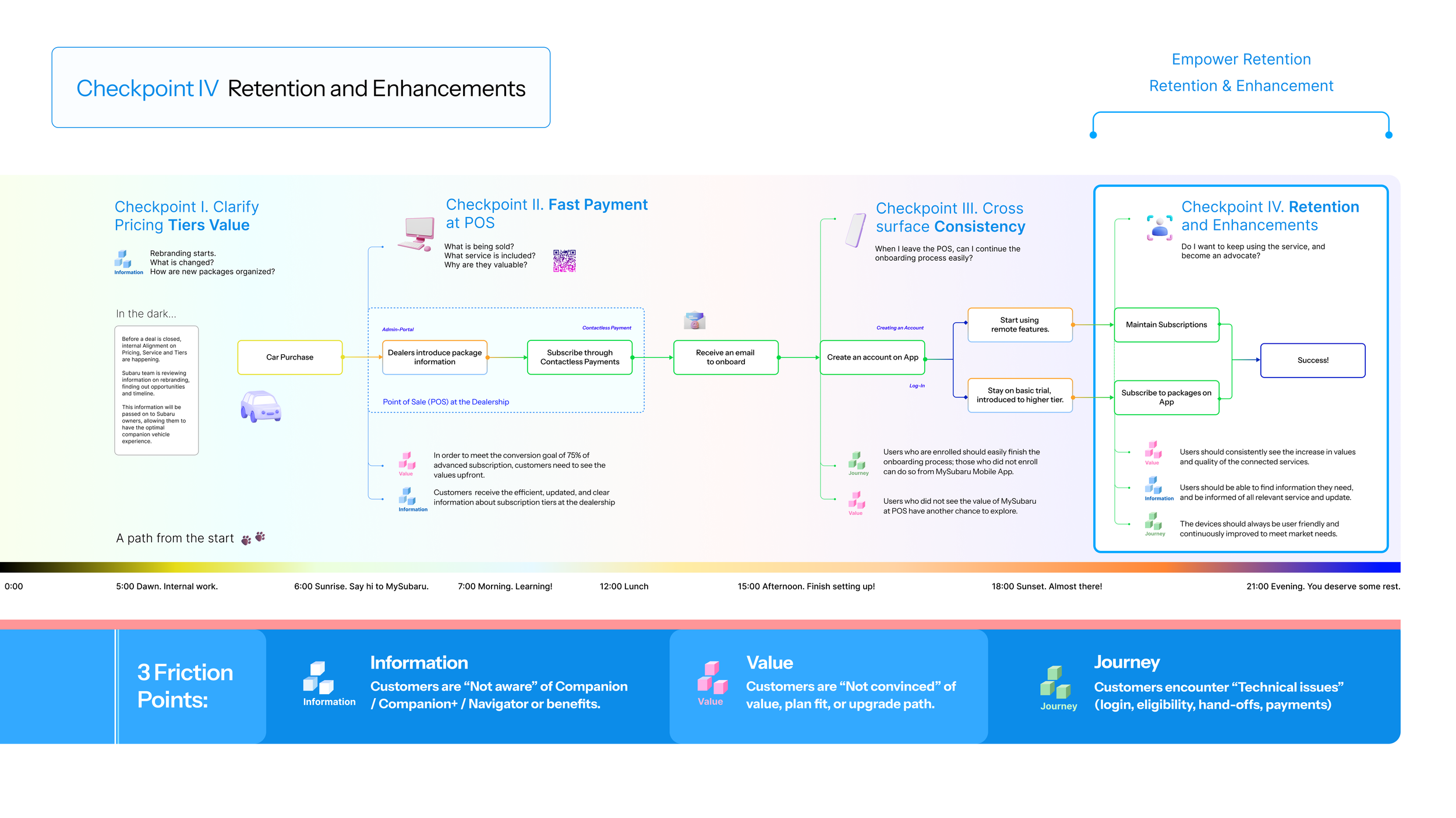 The following diagnostics map covers user onboarding (Checkpoint I - III), and retention (Checkpoint IV). It covers the entire journey from when a customer purchases a Subaru to when they successfully subscribe and engage with the MySubaru Service. Here, we exclusively focuses on the final checkpoints. Previous checkpoints and rationale that led to the creation of this map can be found on the Subaru Onboarding case.