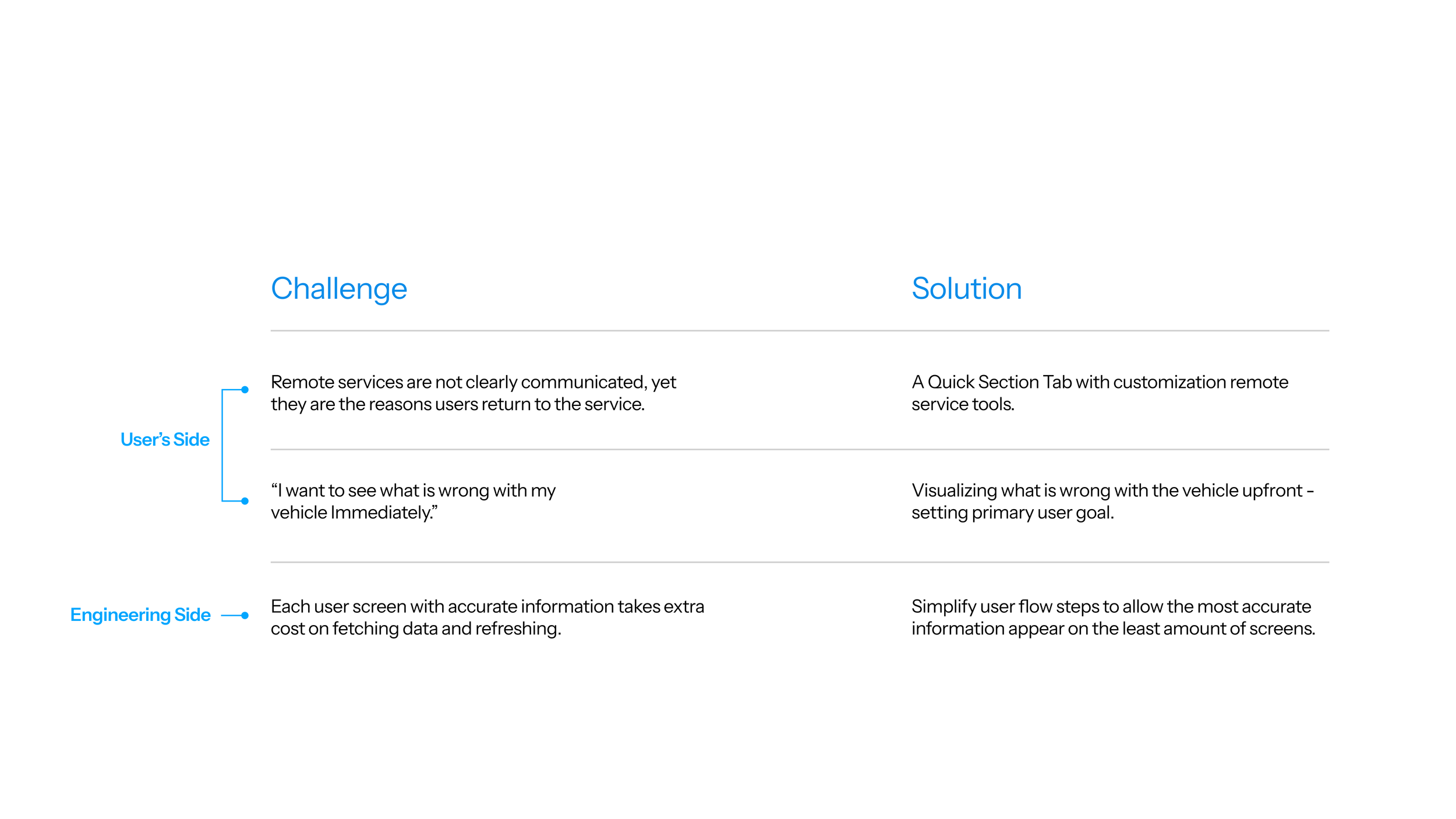 The two key questions lead us to the two user’s side challenges. They can be addressed by redesigning how users engage with remote commands, and the visualization and interaction with a real-time illustrative vehicle. In addition, we encountered with a challenge on the engineering side: Due to the complication in vehicle data transitions, each time the app fetches new data, it requires significant cost. The solution to this issue is to simplify user flow, with the most accurate and upfront information possible.