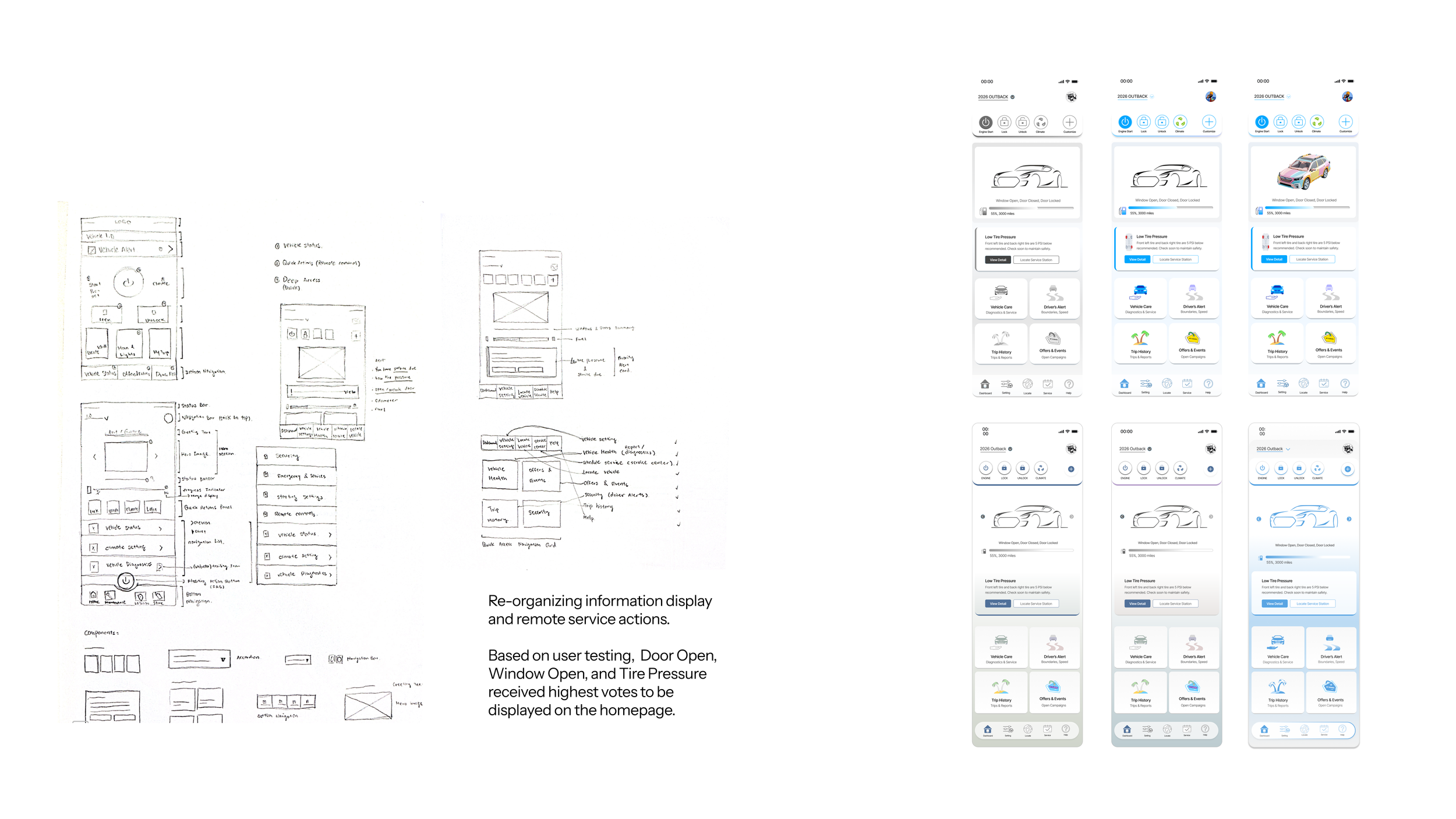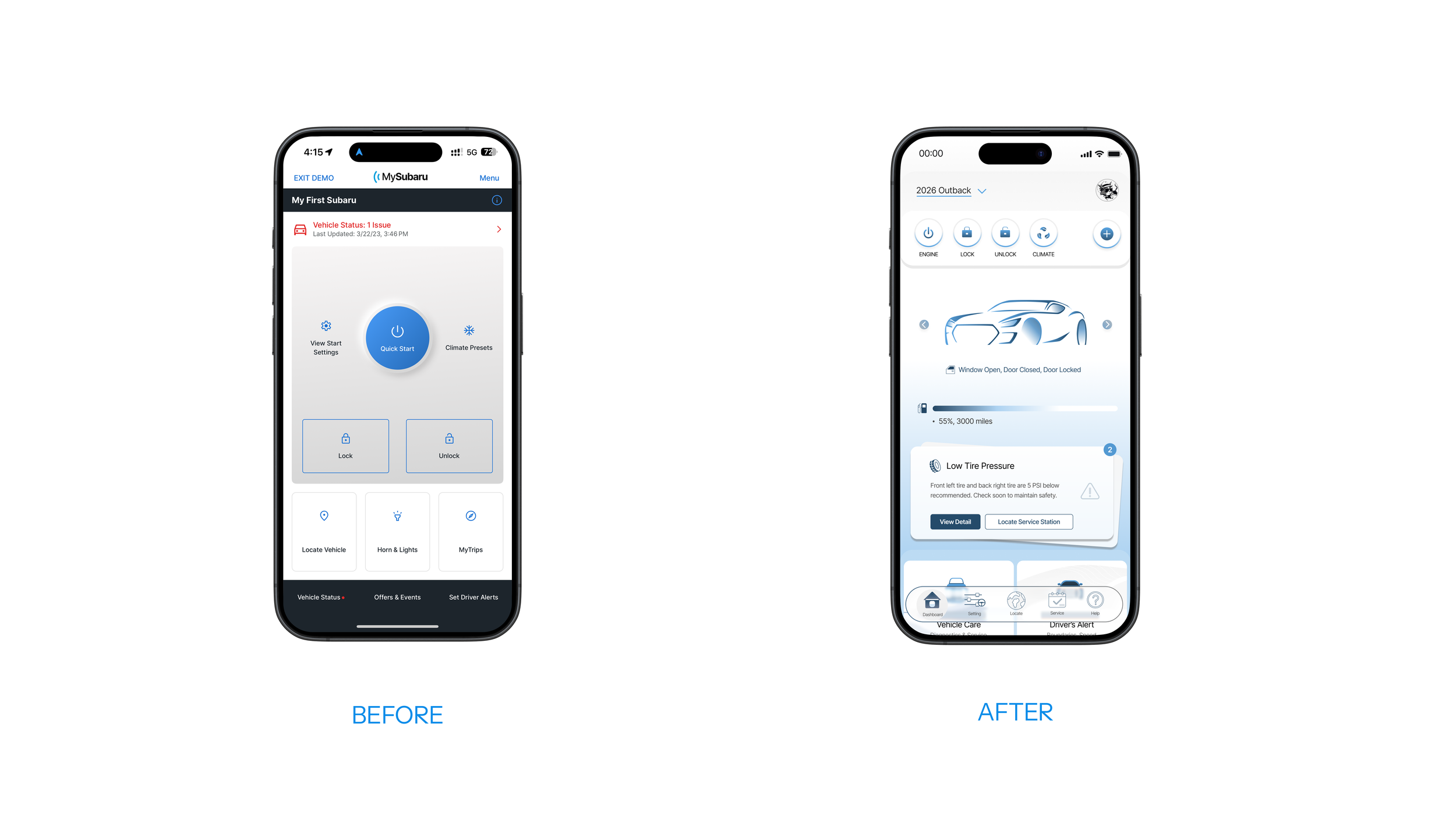 After preliminary iterations on IA and taxonomy, I came up with the homepage solution. The before and after comparison below highlights the changes. Before, only three commands are available, no immediate vehicle information is in display, and multiple steps are required to navigate to view vehicle status.