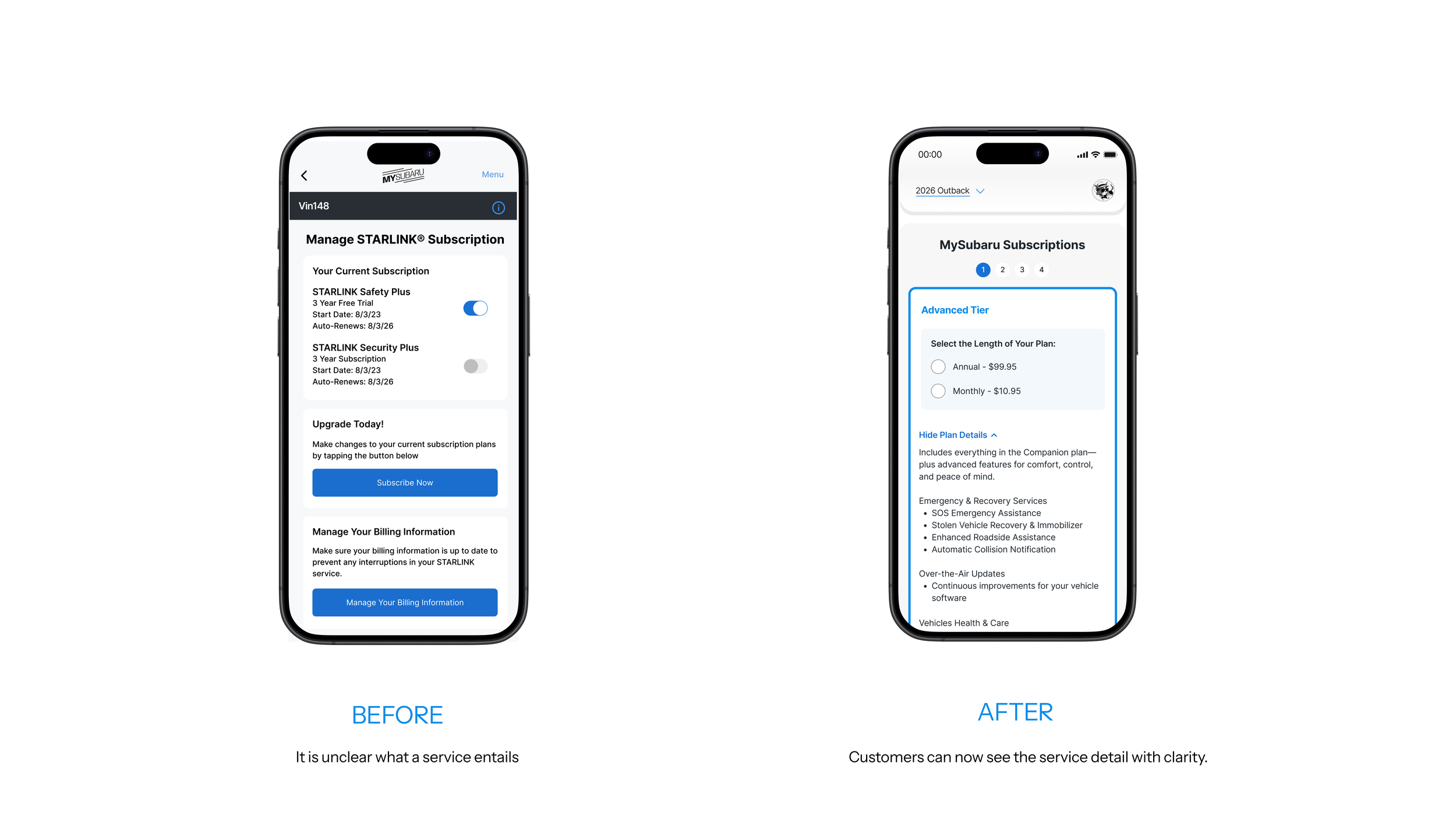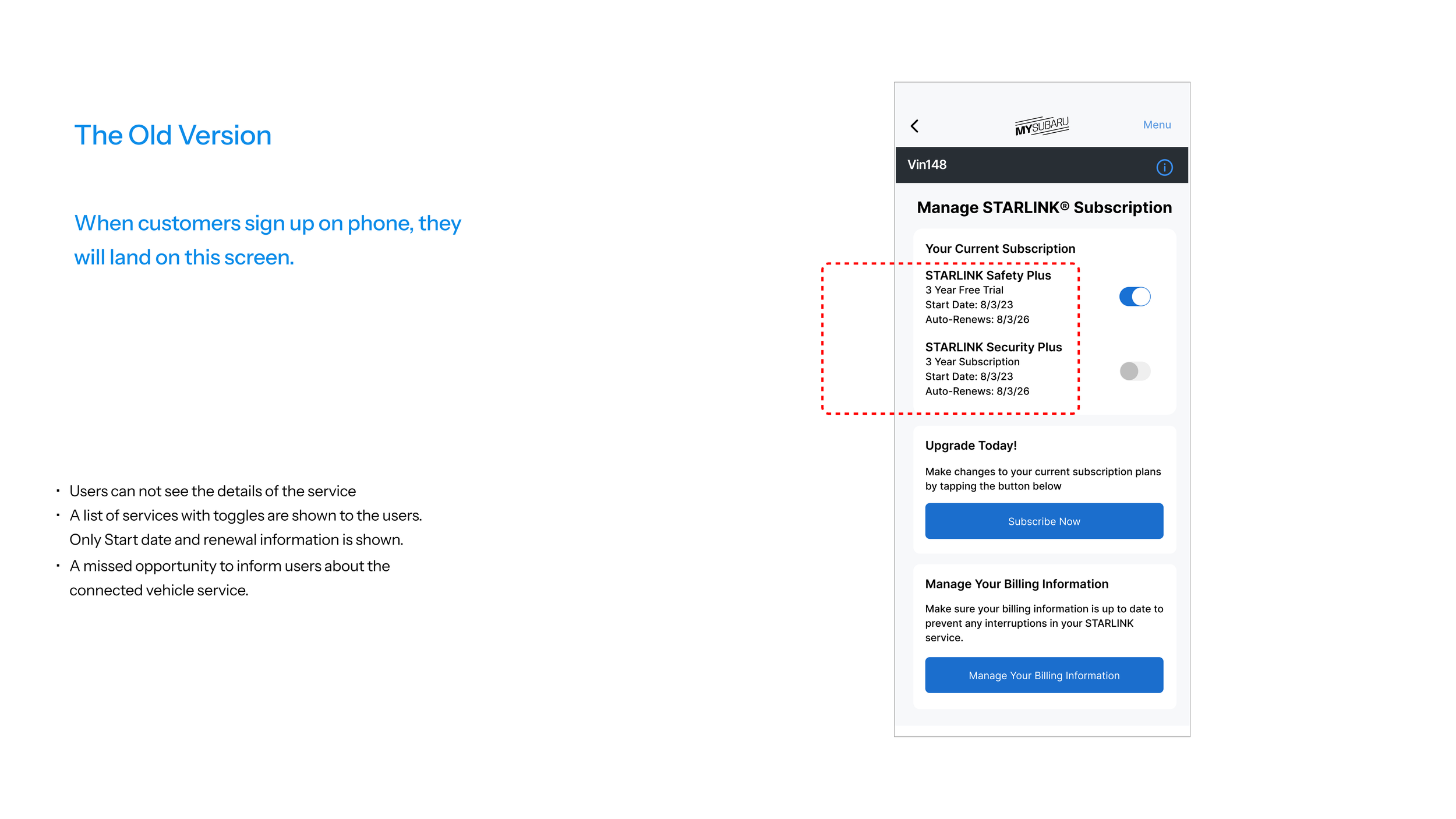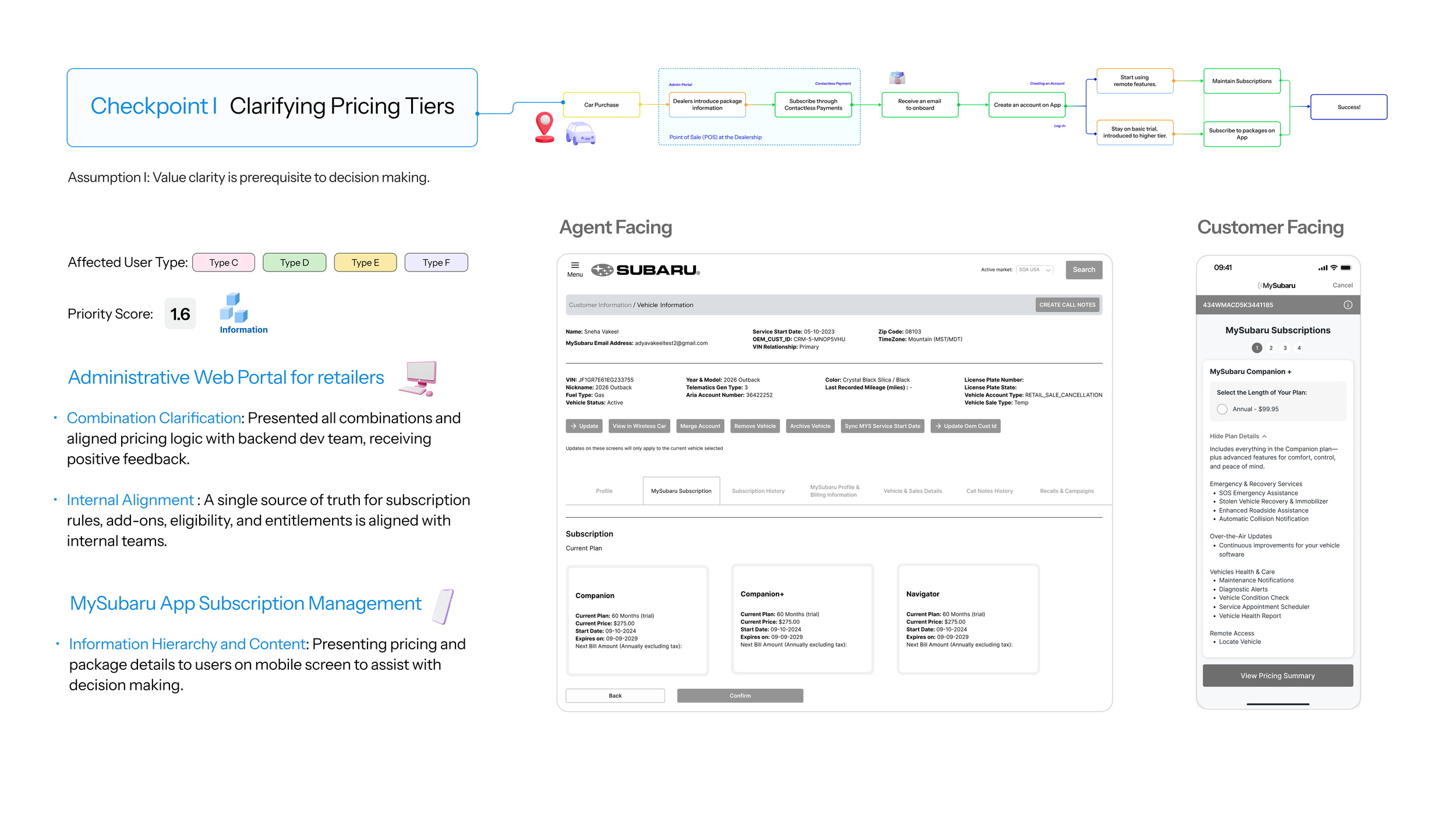 Being the only onsite designer and exposed to multifaceted discussions, I quickly learned that the advanced tier subscription conversion is the Key Goal tied directly to the business profit. It is also the key problem that the company is facing. Sure, the Subaru Digital Companion technology has a solid customer base. Yes, it has a 4.8 customer review. But are values fully realized? The answer is simple - no.