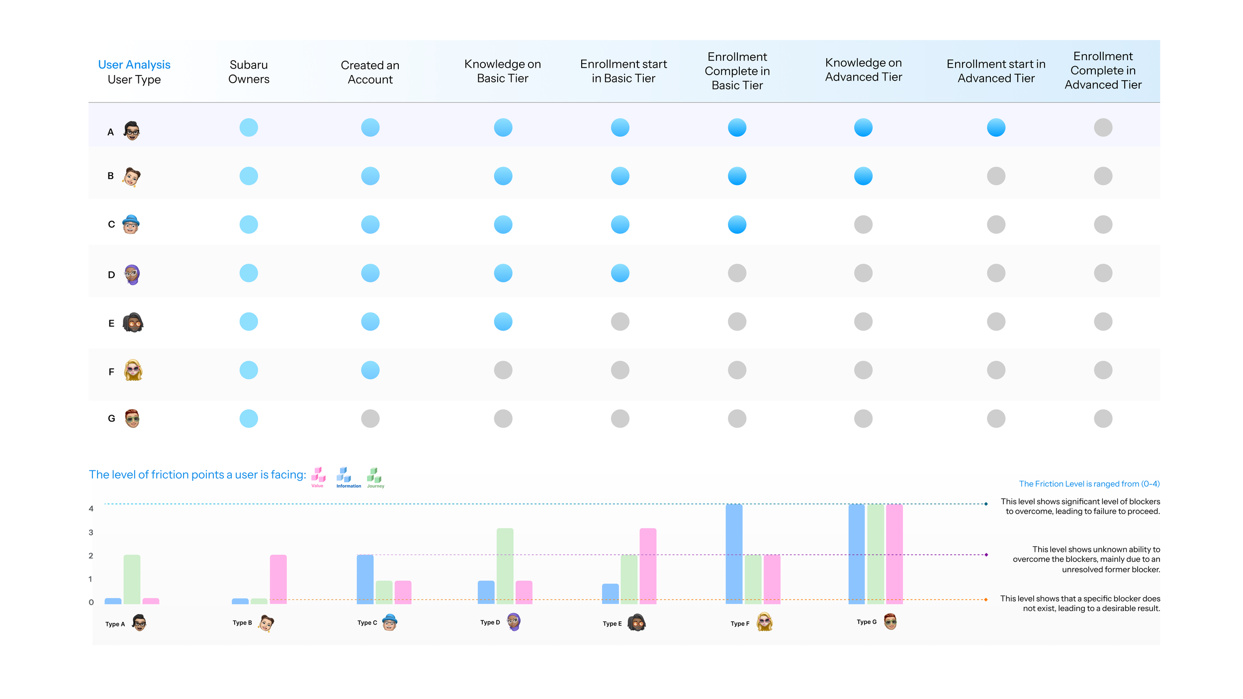 To resolve onboarding difficulties, I’ve first conducted a user Analysis. I summarized 7 user types based on where they are at the on the onboarding journey from purchasing a car, create an account, to enrollment complete in the advanced tier, which is where we want them to be. A blue dot indicates that they completed this step, whereas a grey dot indicates they dropped. This way, we will be able to identify the frictions they are facing, as shown on the bottom chart. For example, if a user have the knowledge on advanced tier, but did not sign up, that means they encounter value friction, because they are not convinced of value that MySubaru has. If a user started the enrollment but did not complete the enrollment, they are facing a journey friction, indicating usability or technical issues; and if a user do not have any knowledge of MySubaru’s service, then they are clearly encountering information friction.
