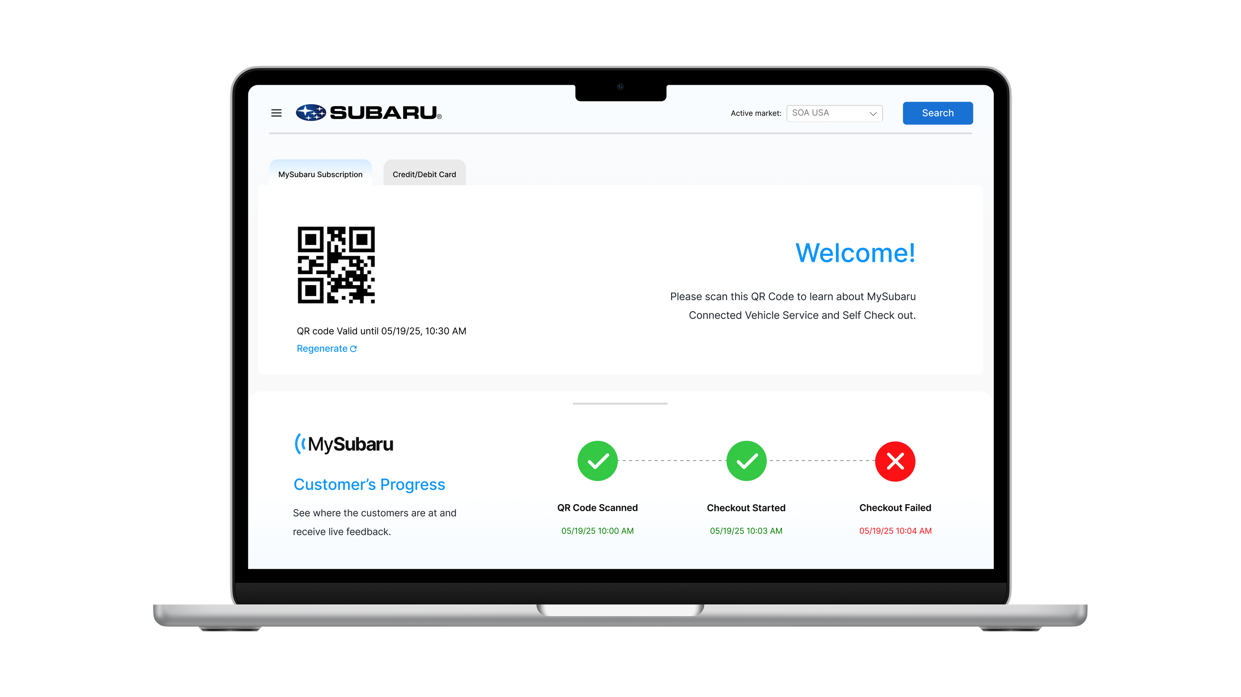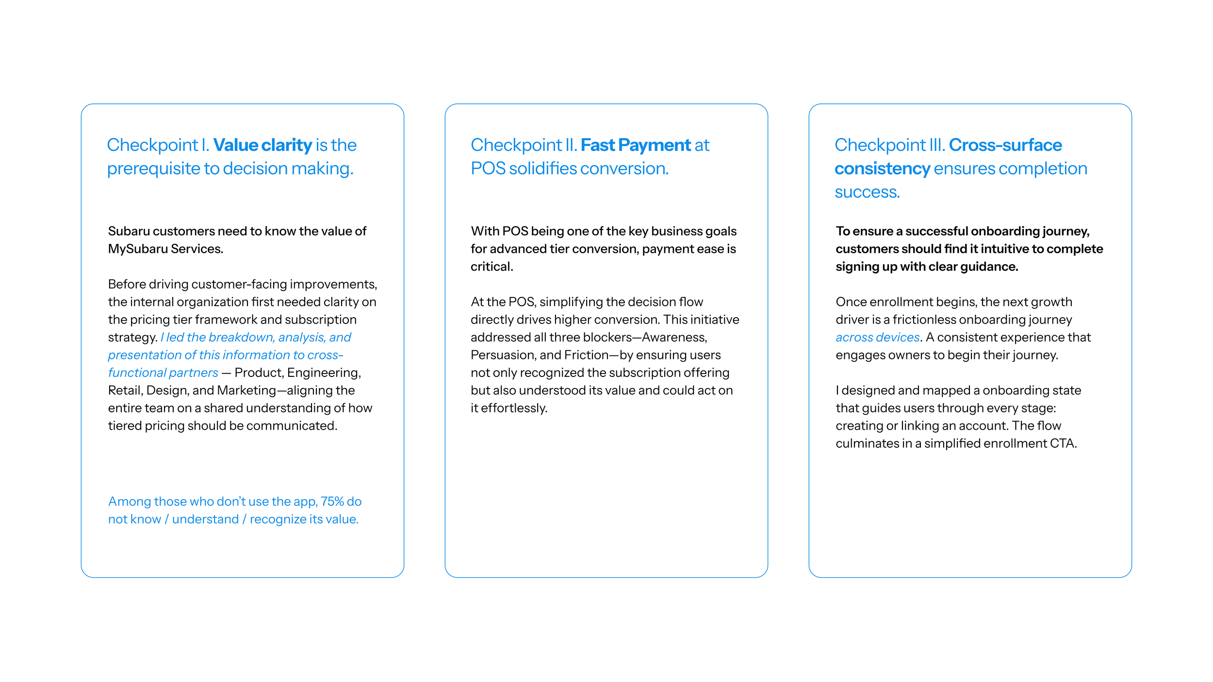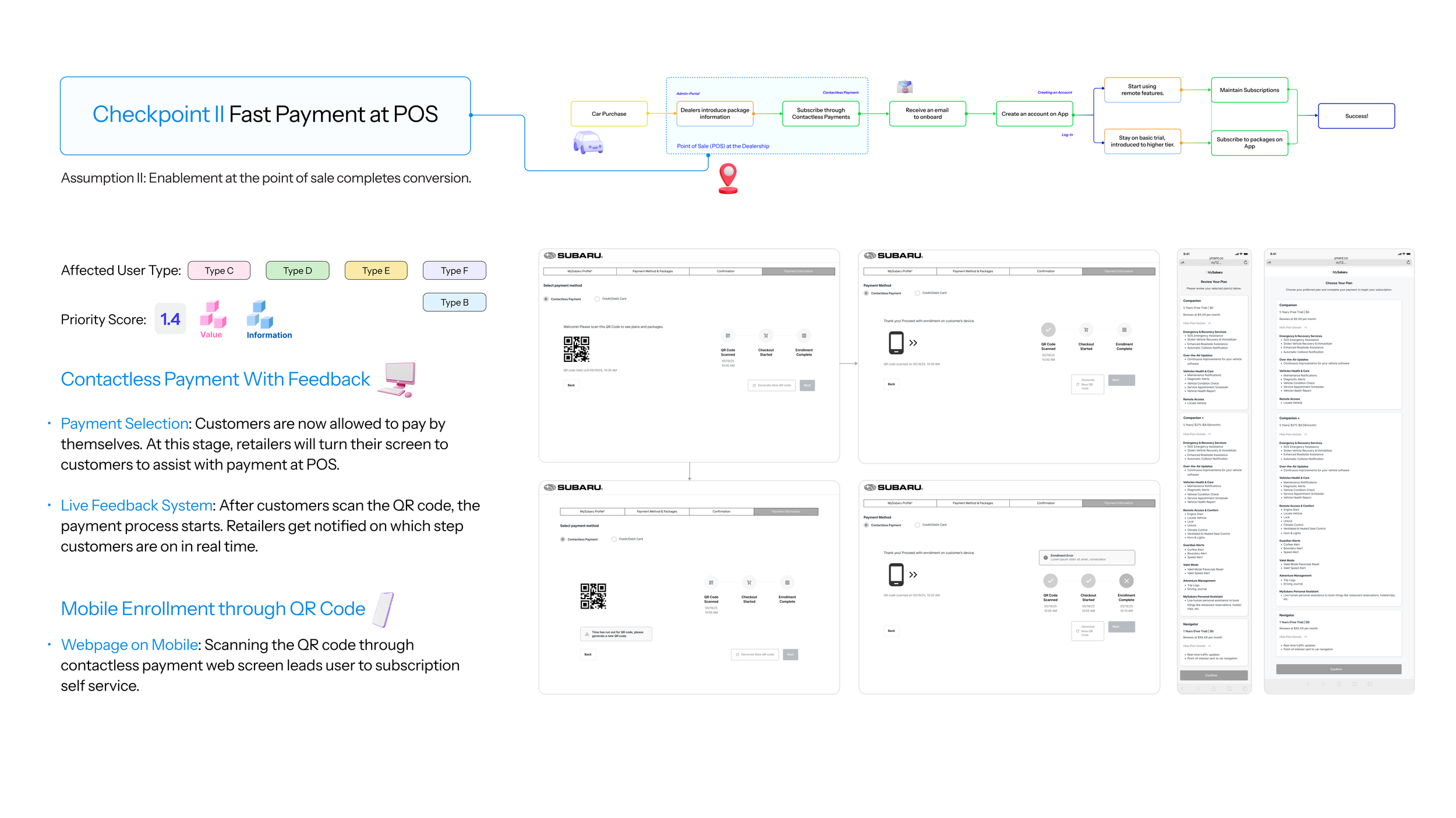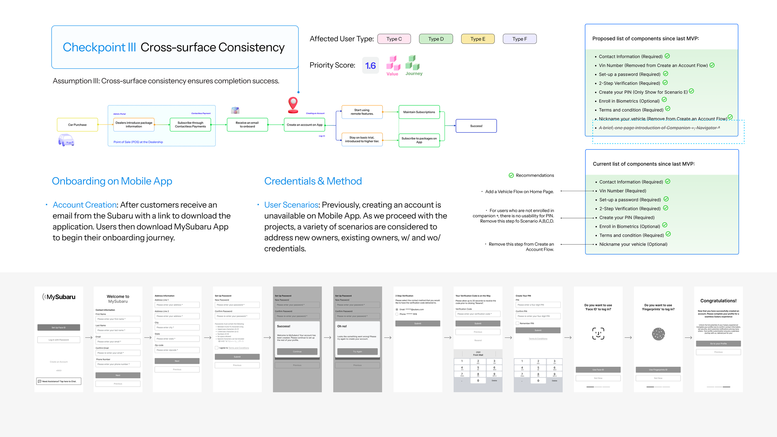 Checkpoint III: To ensure a successful onboarding journey, customers should find it intuitive to complete signing up with clear guidance. What happens after customers pay at point of sale? They receive an email that leads them to download MySubaru Mobile App. However, the old App does not have creating an account feature. Users have to go to the website to complete enrollment. To resolve this, we proposed an account creation journey once they download MySubaru.