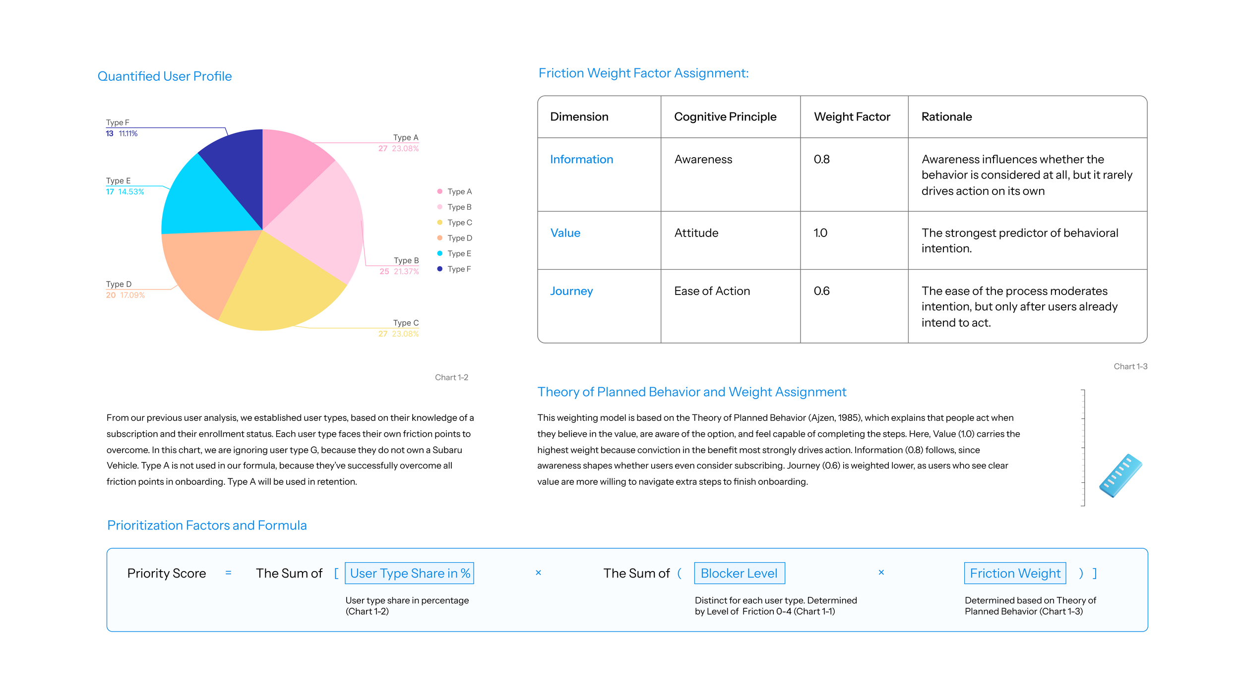 Based on the user type percentage from our survey, and I came up with this prioritization matrix to decide what to work on. In order to sequentialize project on the workflow, I came up with an equation that assigns project a unique priority score, as shown in the box. We already have the User type share in percentage from this pie chart, and blocker level from the previous friction chart. The new thing in this equation is the Friction Weight. Based on Theory of Plan Behavior and our preliminary research result, I assigned weight factor to each of the three friction. Value has the highest weight factor indicating if a user, for example, is convinced of the value, they will be willing to take extra steps to overcome frictions on enrollment journey.