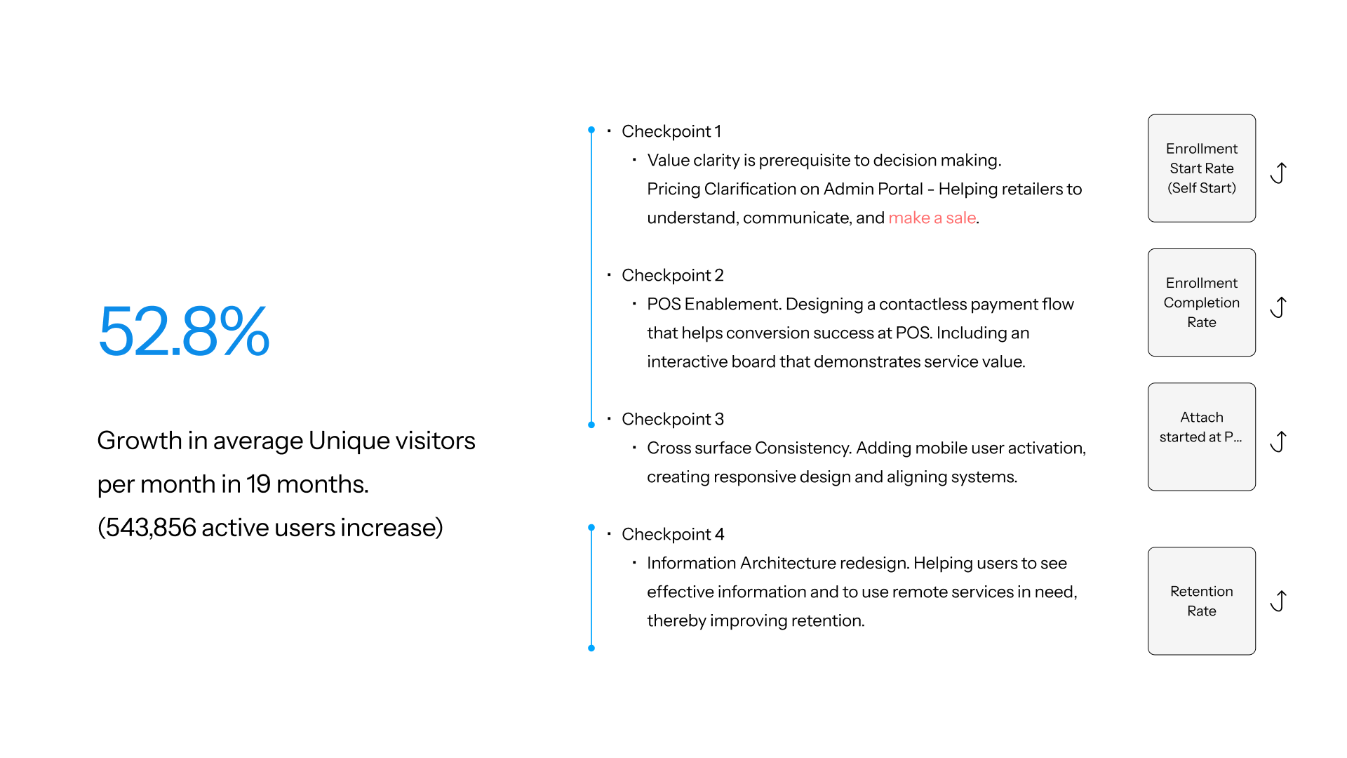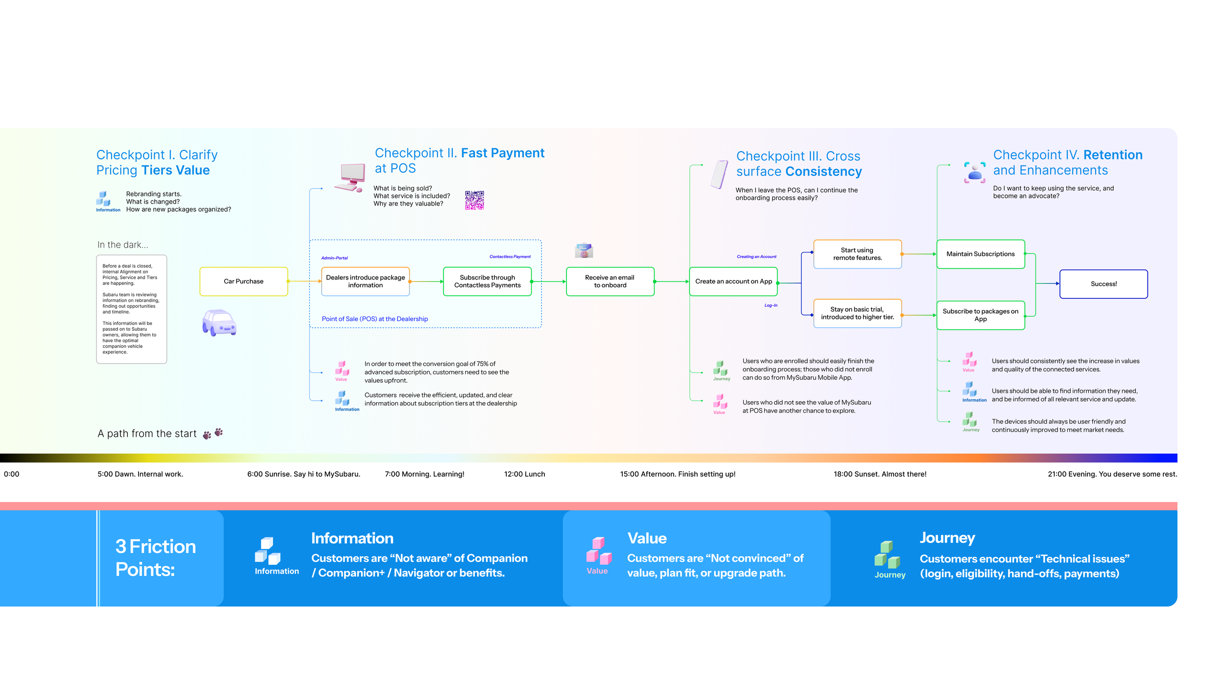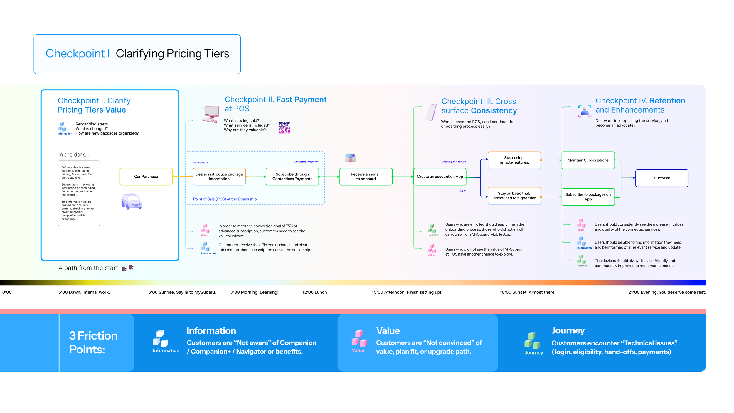I mapped out the user journey from when Subaru customers first purchase a car, all the way to them signing up to the advanced tier and keep on using the service. On this map, I identified where friction points exist and accumulate. These accumulations give us four key checkpoints that users encounter significant difficulties. The first three checkpoints belong to user onboarding, while the last one belong to user retention, which we will cover in another case.