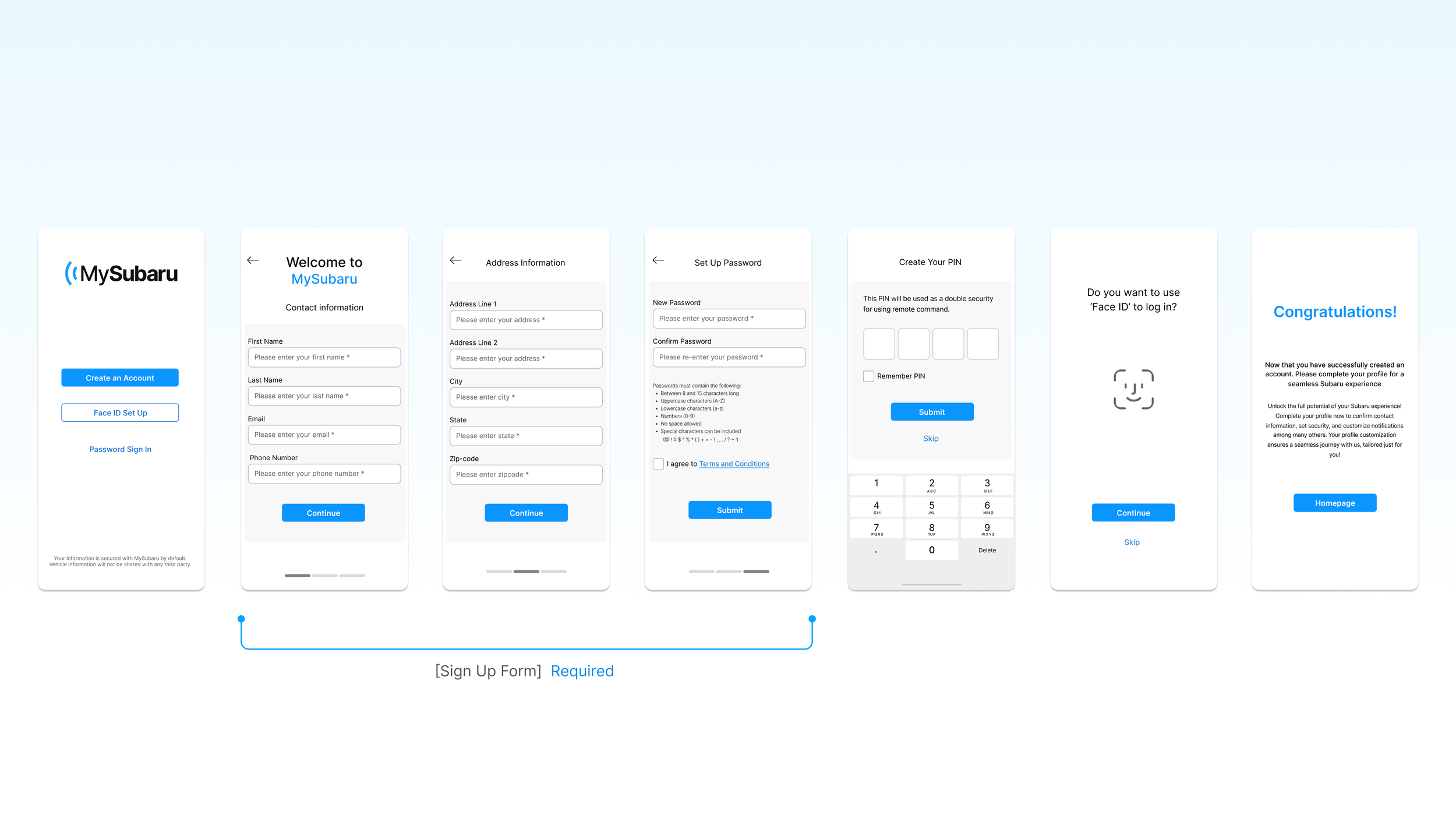 This is the account creation journey. Users select create an account, complete three required step to enter information, which will link them with their existing setup at the dealership. We have skipped the PIN and biometrics enrollment to simplify the sign up journey. Once that’s completed, users are all set.