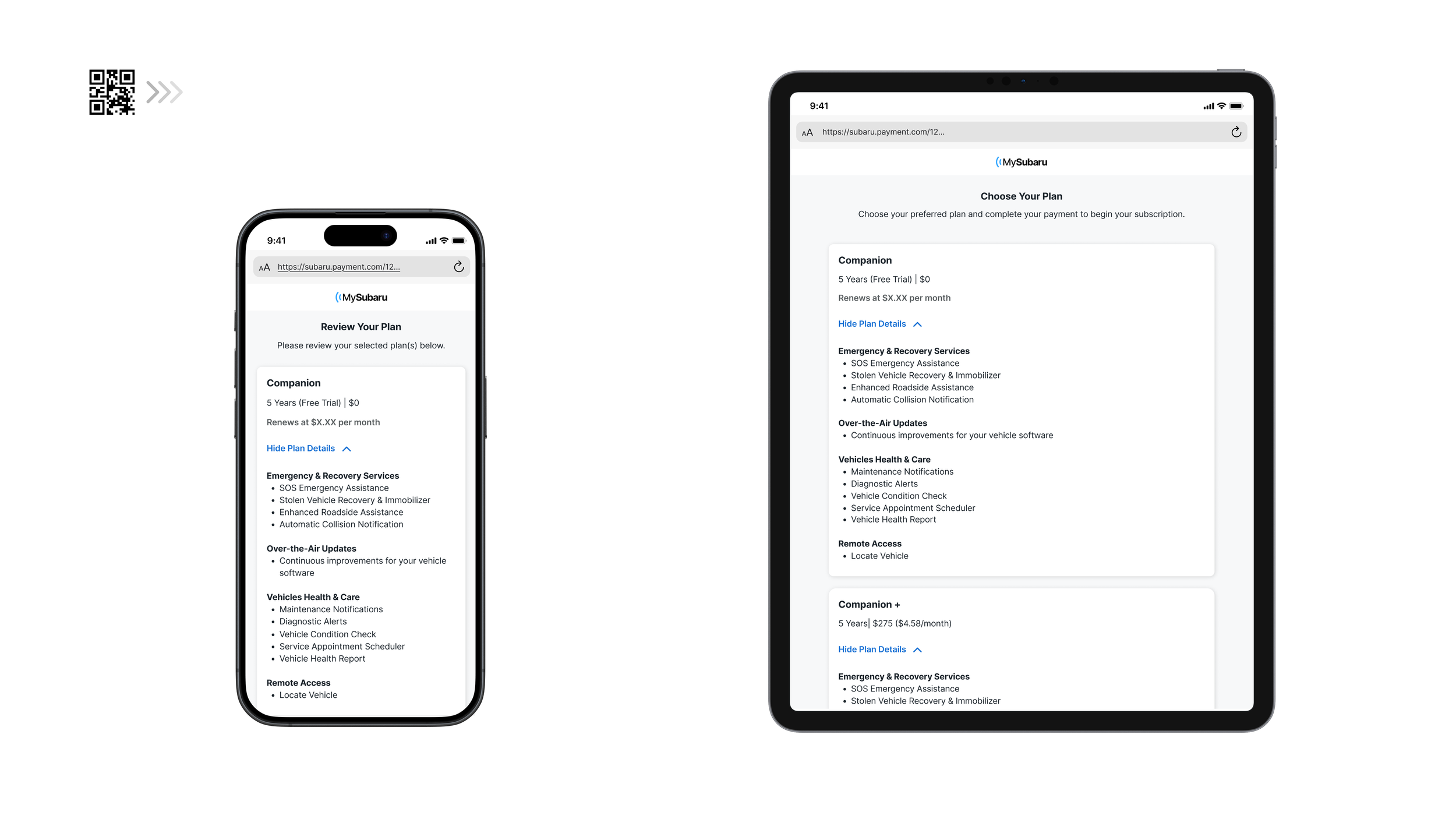 On the customer’s end, the QR code opens up to a subscription selection page, where again, incorporating the tier clarity solution, they will be able to learn about the service and make a decision on their own.