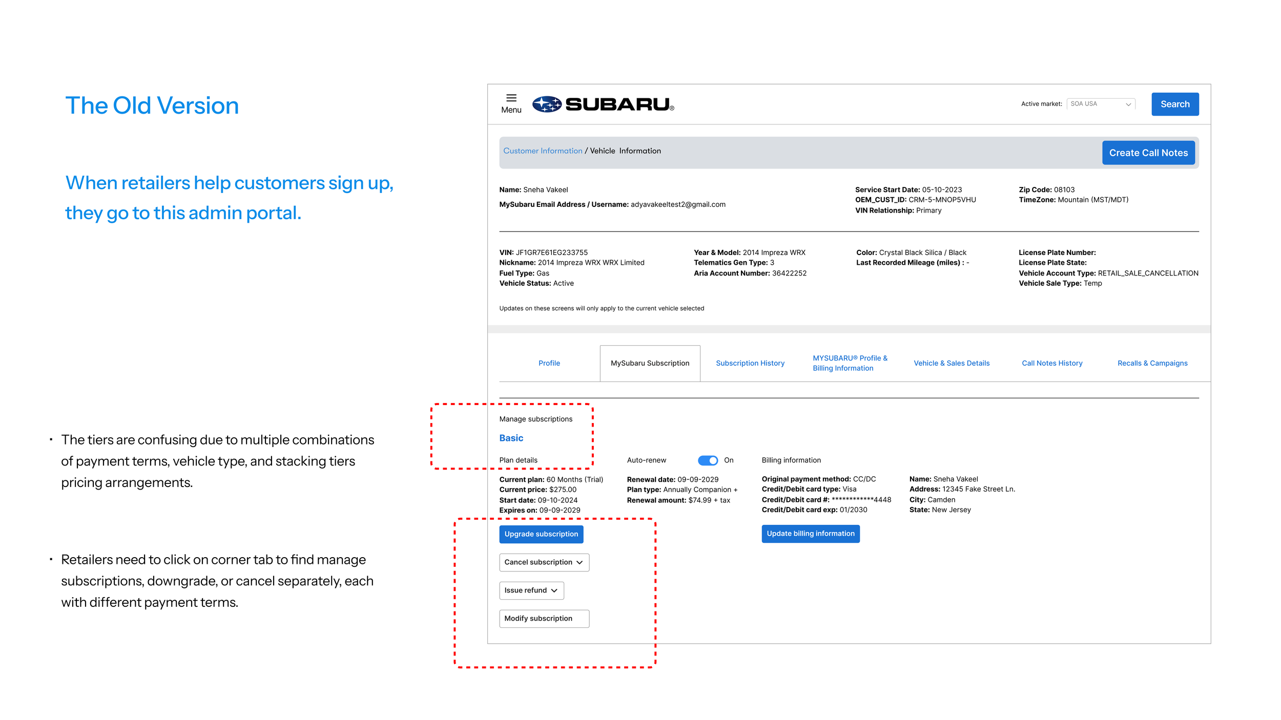 The problem with retailer facing admin portal is that the tiers are confusing due to multiple combinations of payment terms and stacking tiers pricing arrangements. When retailers help customers to enroll, retailers need to click on corner tab to manage subscriptions which dissolves into multiple flows. The singularity of tier information confuses retailers as the combinations are not clear.