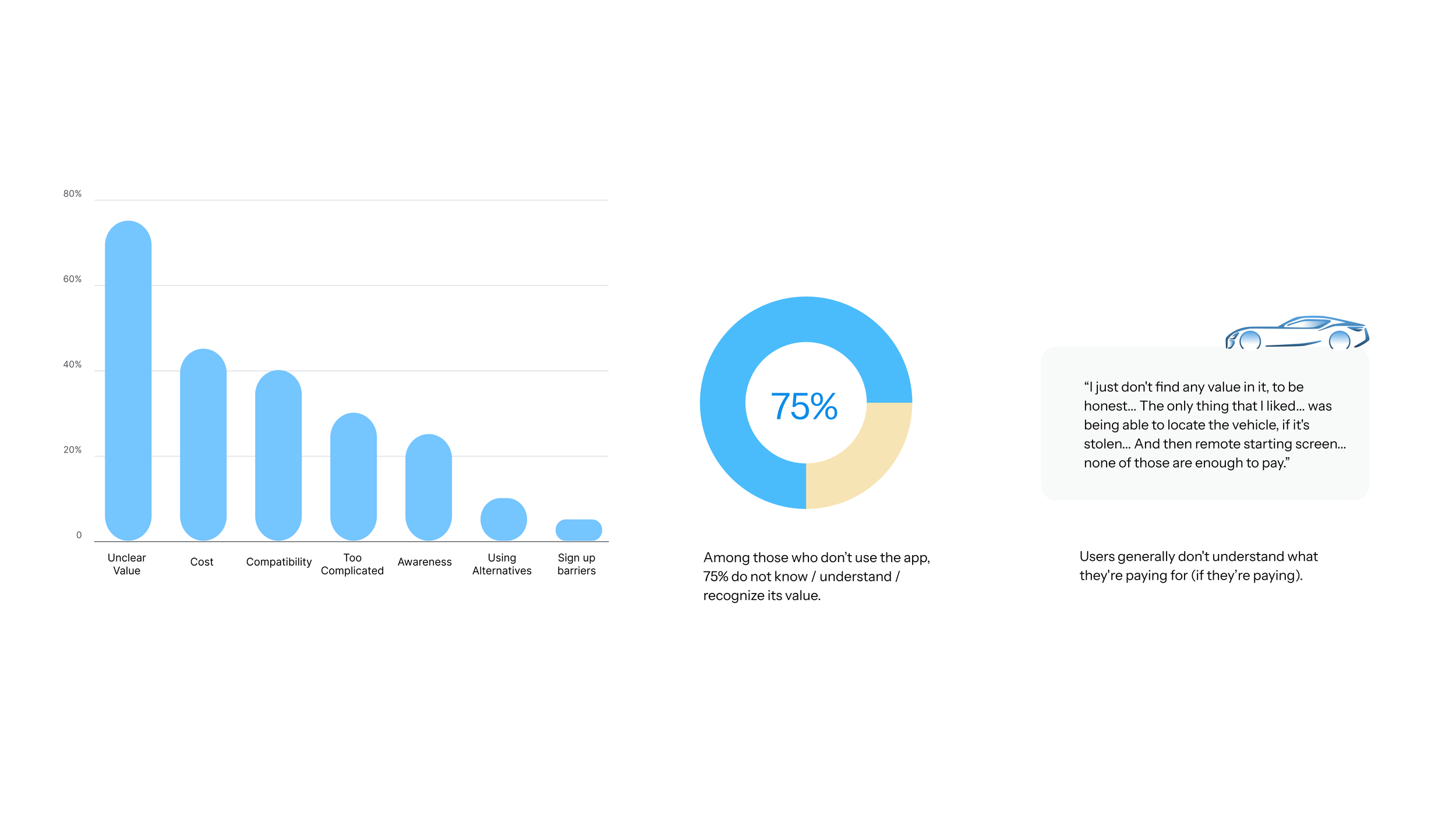 Among those who don’t use the app, 75% do not know / understand / recognize its value. Users generally don't understand what they're paying for (if they’re paying).