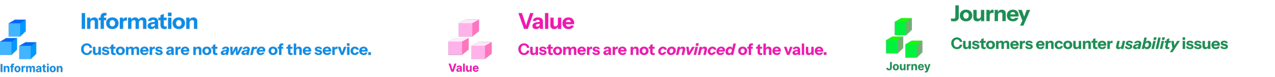 Reasons that users are not using the service include “Unclear value, Cost, Compatibility, seeing it as too complicated, do not have the awareness, are using alternatives, or encountering technical barriers. By categorization, we summarize three key user insights: doubting the value, seeing it as hard to use, and having a knowledge gap.